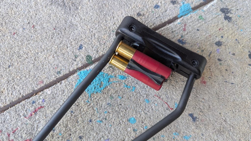 The shell holder is a great idea in theory, but it would consistently drop a round when fired. It is hardly secure. Luckily, shotgun shells mostly come in bright colors, so it would be easy to find them in the wild.