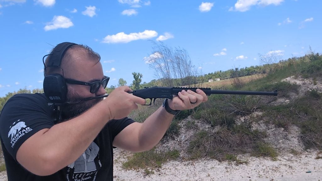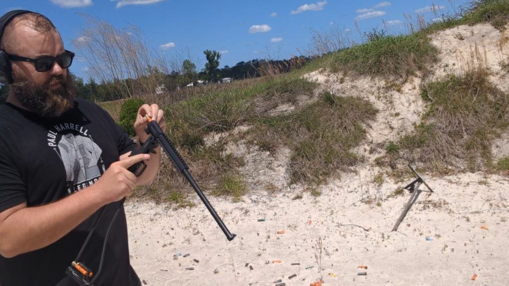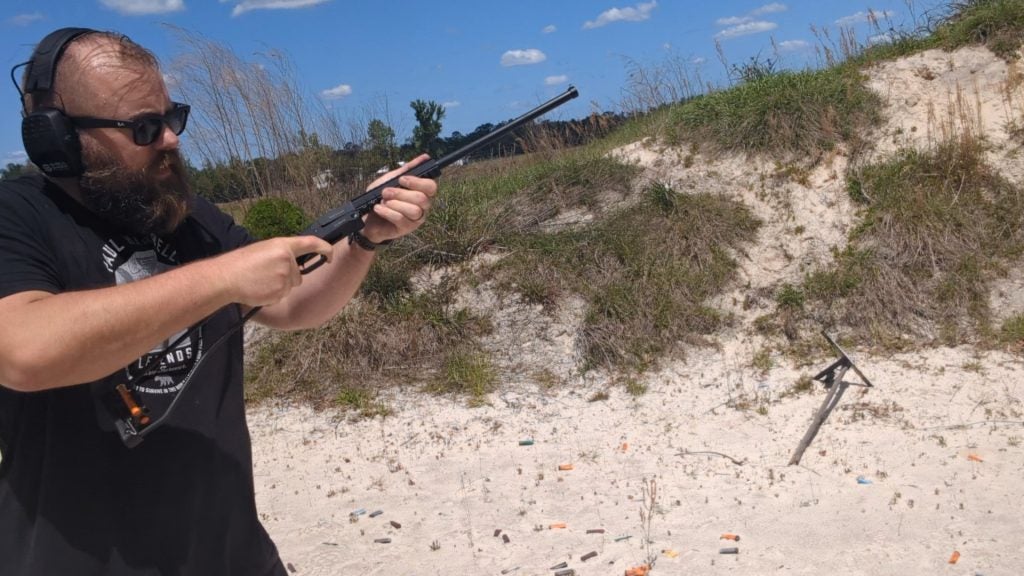 The first thing I did was load a 3-inch .410 000 buckshot Remington round, sending five big pellets. The second thing I did was regret it. Okay, I am being a little facetious, but hot damn, this thing’s recoil surprised me. I am used to .410s having light, dandy recoil; this thing packs a bit more sting, landing somewhere near 20 gauge territory.
