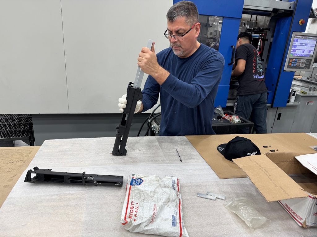 After being removed from the mold, the excess polymer, called runners, is clipped, and blocks of aluminum are placed into the receiver to help maintain critical dimensions as the part cools over a 24-hour period.