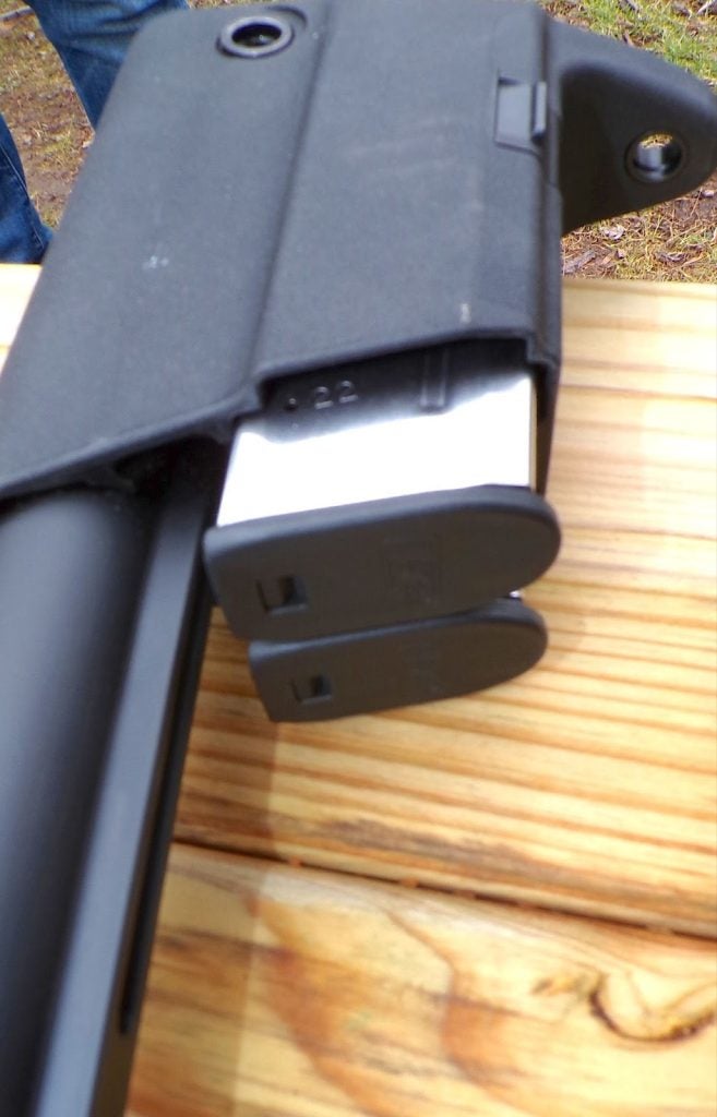 One unique feature… dual magazine storage in the stock. They changed the locking mechanism to make it more intuitive… the original worked backwards, to my way of thinking. Here, you just press the release button for whichever one you want to grab.