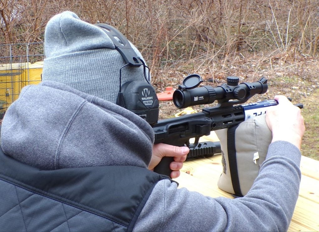 I took these at my backyard bench, prior to, and during shooting. The gun sports a Monstrum Ladon 1-6×24 FFP LPVO from a previous review. Hindsight, which is always 20-20, told us we should have reversed the mount to bring the scope closer to the shooter, but we carried on. Future shooting of this gun/scope will require the mount to be reversed.