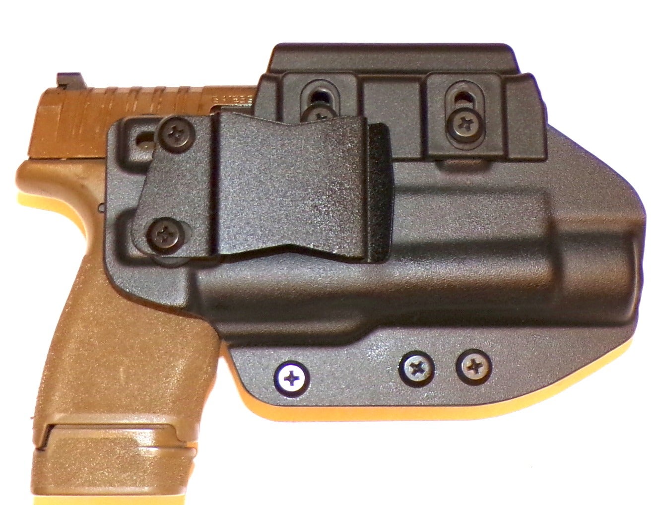 Notice a couple of things… the adjustability and the ambidexterity. You have screws you can adjust. I know many holsters have screws, but they usually adjust only retention. Here, you can move holster parts around or move the tab to allow the holster to be used on the other side… the lefty in me appreciates that. So, if you need a right-hand, left-hand, or crossdraw holster, you’re covered.