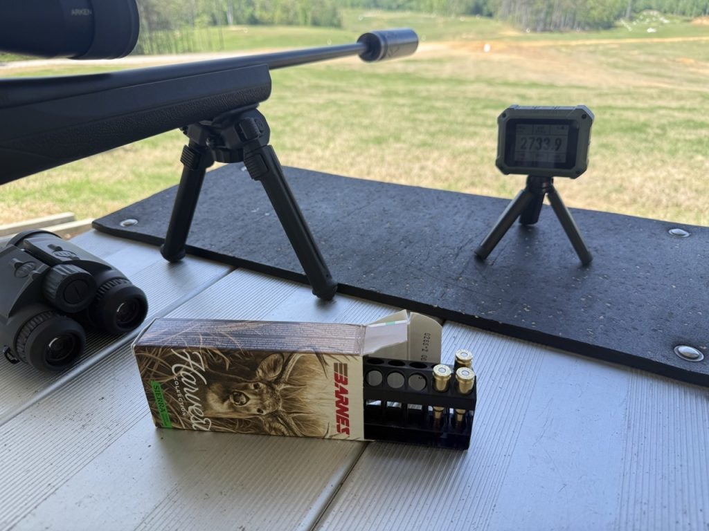 The Athlon Rangecraft chronograph told an interesting story right away. The 90-grain TAC-TX was humming out of the 22-inch barrel at an average of 2,860 fps. That’s right in line with Barnes’ published velocity for this barrel length, and it’s moving. The 100-grain GameKing came in at 2,716 fps, which is also consistent with factory specs but obviously a good bit slower than the lighter bullet.