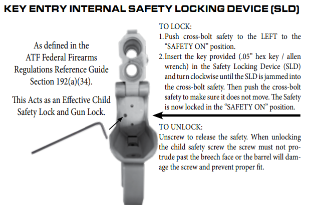 Also, the gun has two safeties. One is the crossbolt safety on the frame, and the other (child safety device) involves putting that safety on “safe”, opening the barrels, and using the provided Allen wrench to physically screw the internal safety locking device into the crossbolt safety. That will lock the safety, and render the gun inoperable.