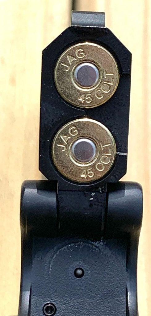 In terms of the .45 Colt, you see where the shots landed. They were actually very close to the point of aim, and I didn’t notice much difference between the barrels.