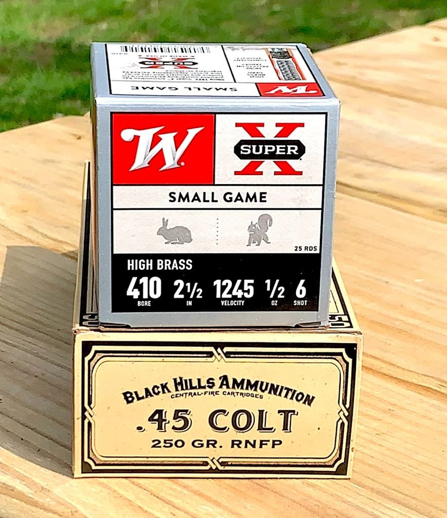 As you can see, I put a target up at about five yards and let fly with first, a .410 shell and then some .45 Colts. The ammo I shot is above, if you’re interested. Black Hills makes some pretty interesting loads, especially in the “old-timey” .45 Colt. Even the typeface invokes memories of times gone by. They sent me some .45 Colt, 250-grain loads for this review, for which I am grateful.