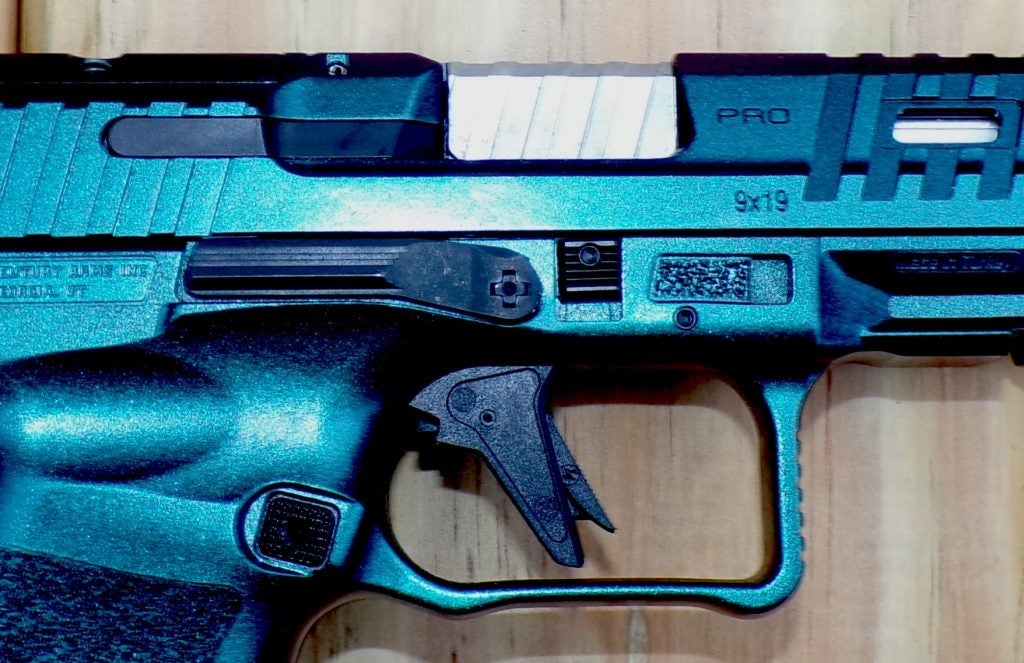 Here’s a close-up of the right side, showing the flat-faced trigger, slide release, and takedown lever. Each side has a small, textured rectangle above the front of the trigger guard. I imagine this is supposed to be a resting spot for your off-hand thumb, and, on the other side, a place to stage your trigger finger before it hits the trigger. The trigger guard is undercut pretty deeply.