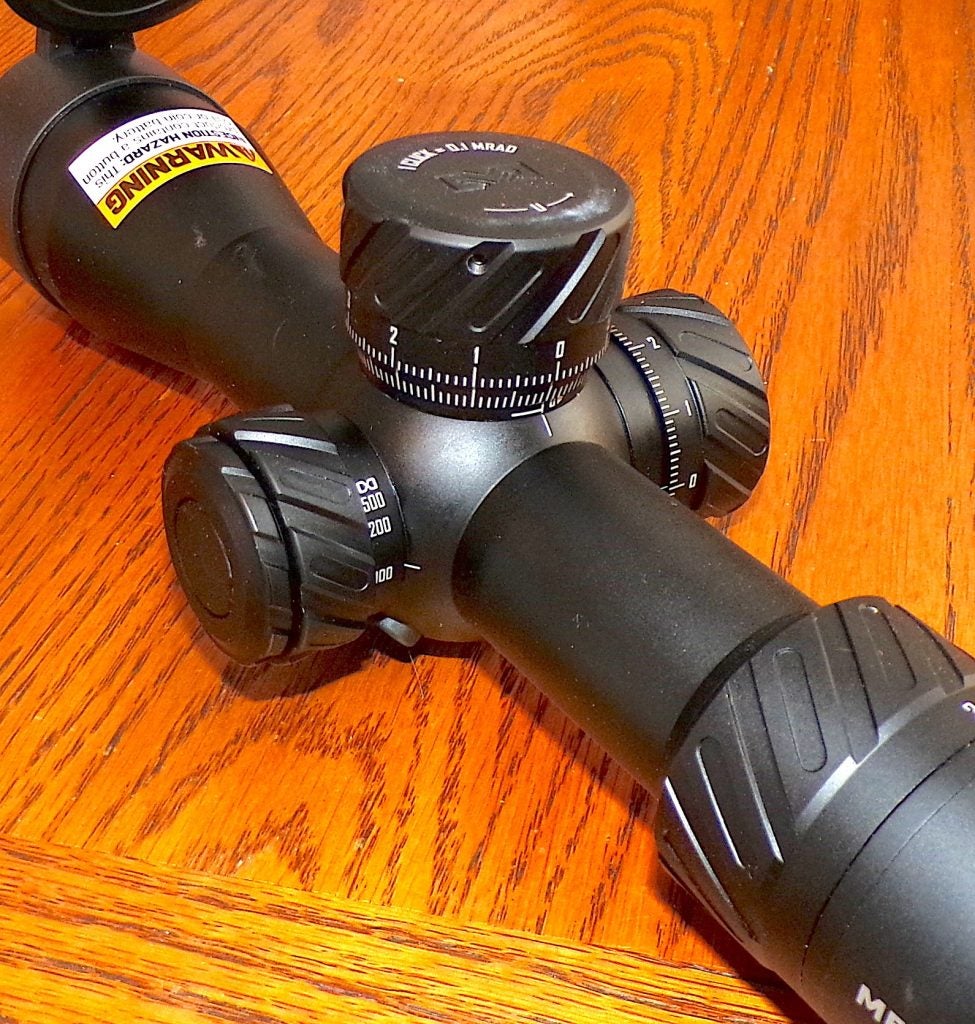 This scope is a marvel of modern technology. It is parallax-adjustable from 30 yards to infinity. We’ve already mentioned its FFP capability, and the reticle can be illuminated via either a red or green light, with several intensities of each. This scope is no lightweight, at 28 ounces, and it has a chunky 34mm main tube. That helps with light transmission. The reticle is the M3 Mil Reticle, with (from the scope’s owner’s manual): 12 Mils of holdovers broken into .2 Mil increments for exact shot placement on the whole MIL lines and .5 mil dots on every half mil between the whole mil lines. 1 to 5 Mils of left and right wind holds allow adjustment for 20-30 mph winds with the most popular calibers out to 1,000 yards. Got that? The reticle is made for extreme precision.