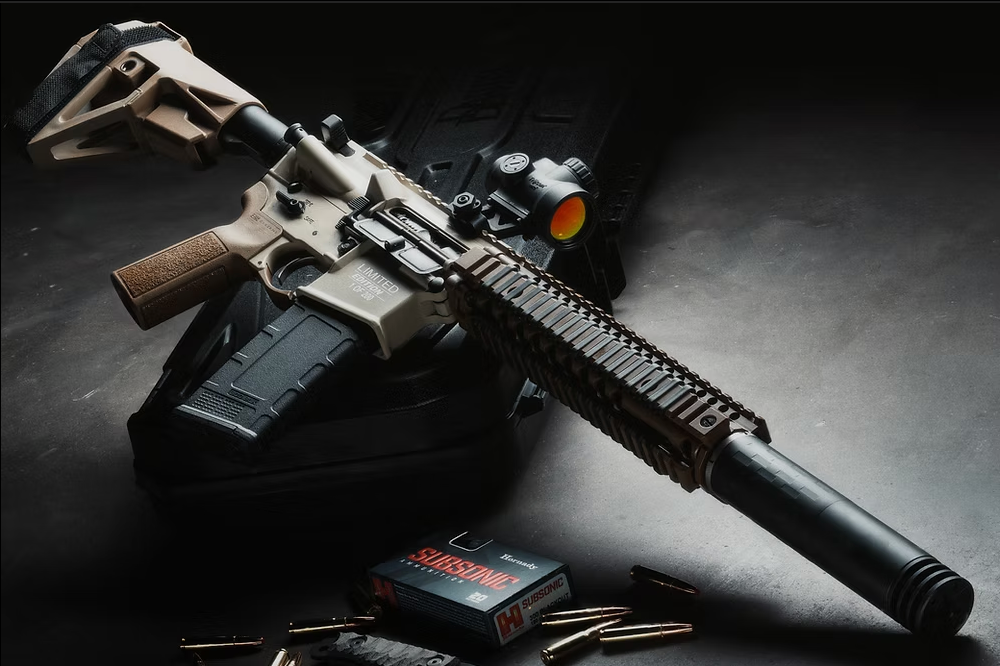 Built around a 10.3-inch barrel and finished in FDE, the pistol uses the Daniel Defense RIS II FDE quad rail and furniture from B5 Systems, including the Coyote Brown pistol grip and trigger guard for improved ergonomics. The package also includes SB Tactical’s SBA5 pistol brace.