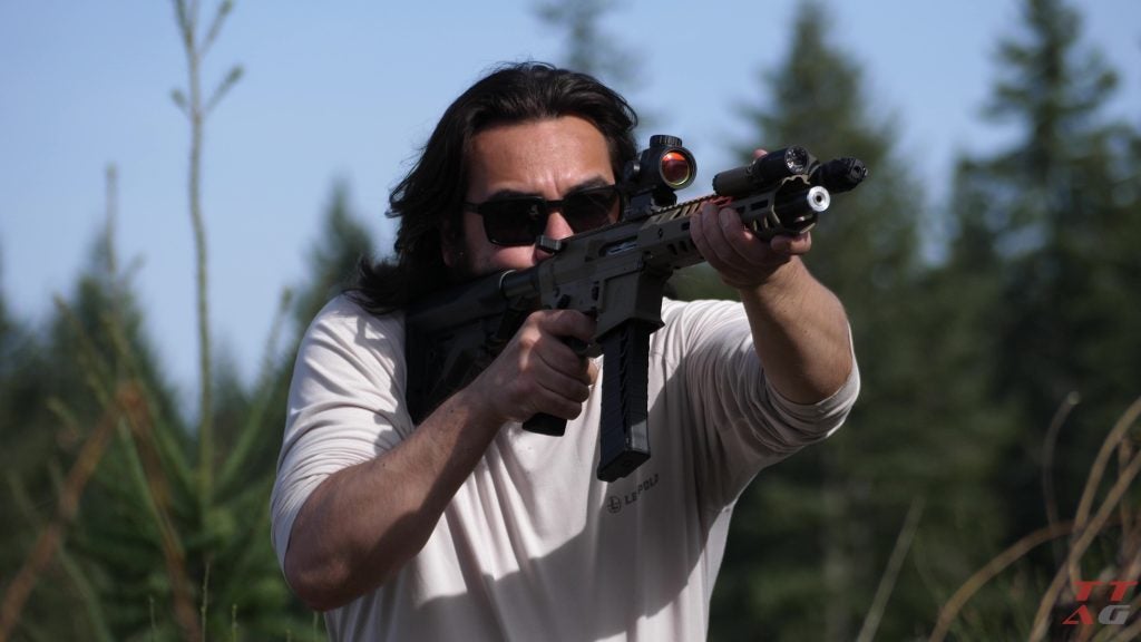 The Angstadt Arms Vanquish AR-22 Integrally Suppressed Barrel is great with subsonic ammo, but in its 12.5″ configuration(seen here), not exactly “hearing safe” with most loads.