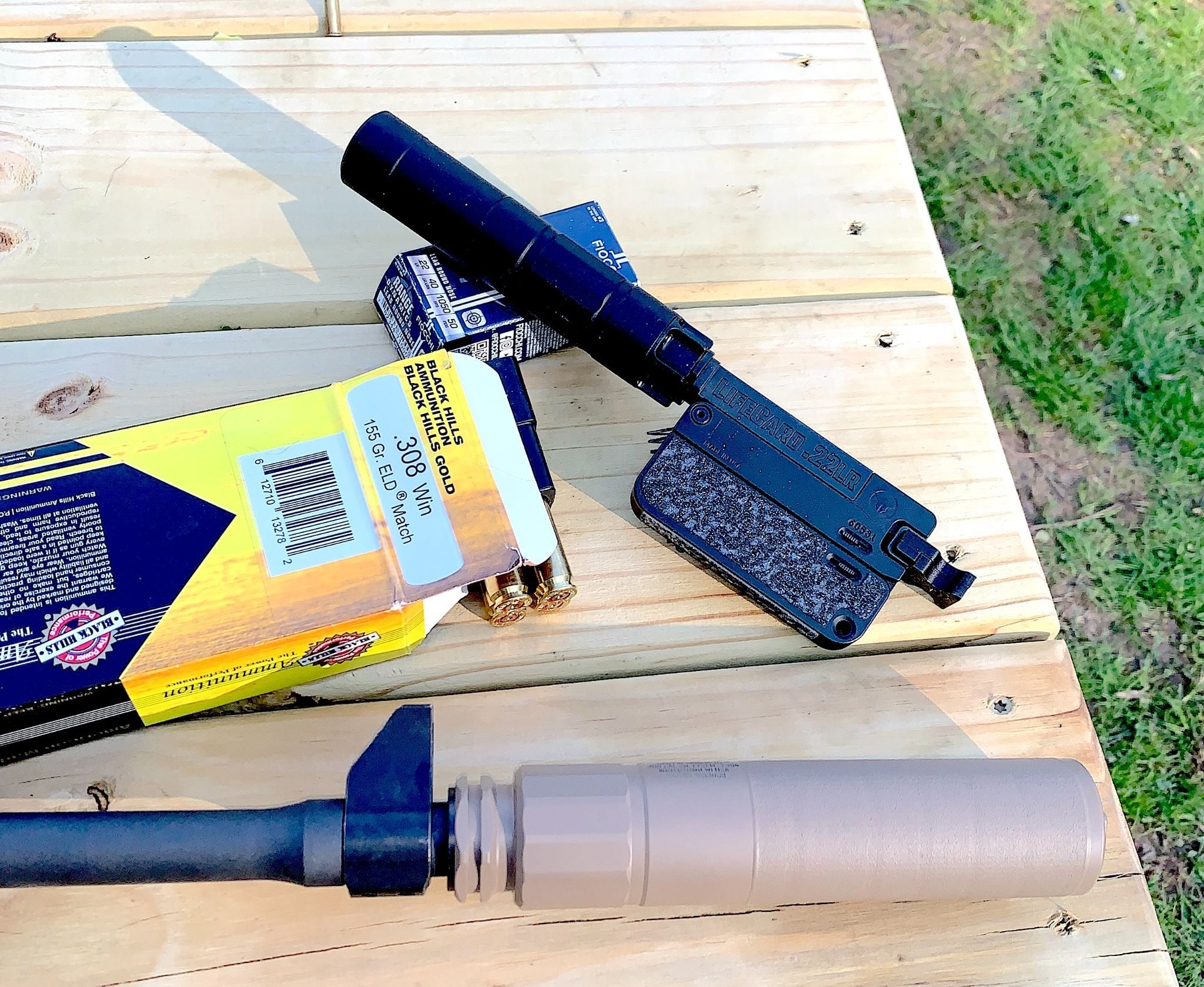 The .22 showed an average reduction of 22.8 dB, while the .308 averaged 14.2 dB. The LifeCard exhibited a quiet “pop”, about like a soft pellet gun, while the Ruger sounded about like a .22 Magnum fired from a 6-inch revolver. My brother-in-law was shooting the LifeCard, and after the first shot, his eyes got big… he couldn’t believe how quiet it was.