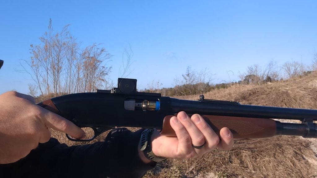 I started with some basic Fiocchi reduced-recoil buckshot loads to zero the gun. It chewed through the 25 rounds without an issue. The dot made it easy to land two rounds of buckshot in about .80 of a second at ten yards into an IPSC-sized A-zone. That’s certainly fast enough for two and four-legged threats.