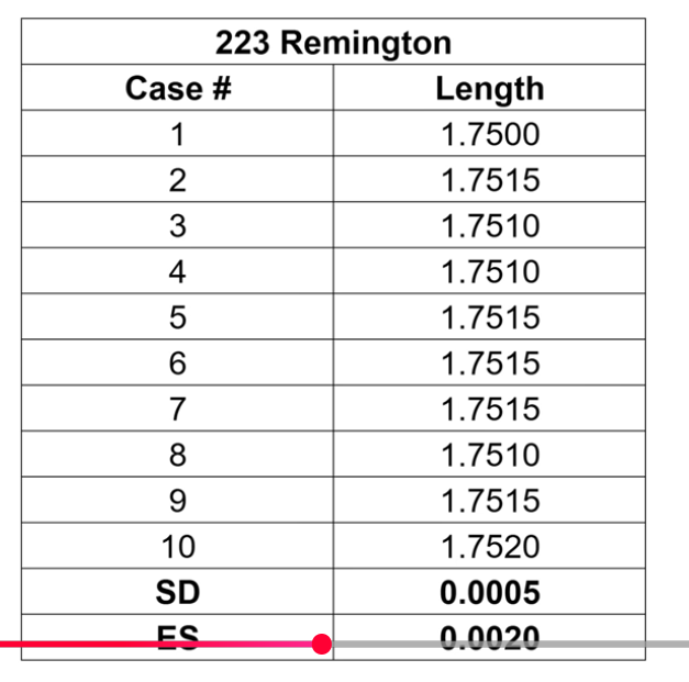 I found a really good video by the Ultimate Reloader… I like his videos. He knows what he’s doing. He was demonstrating this machine, and he trimmed 10 cases as a consistency test and plugged the numbers into a spreadsheet. Here’s what he got (minus the red video progress line…). The stated case length in the Hornady reloading manual is 1.760 inches.