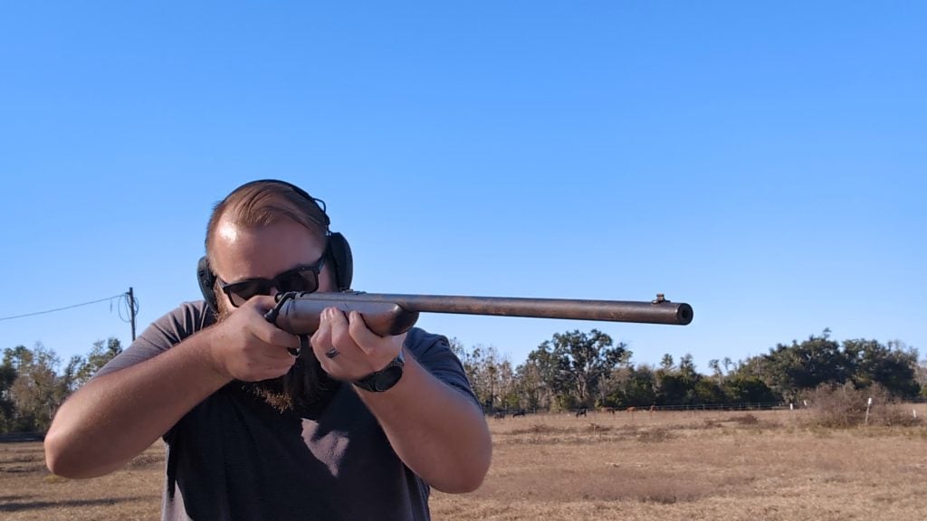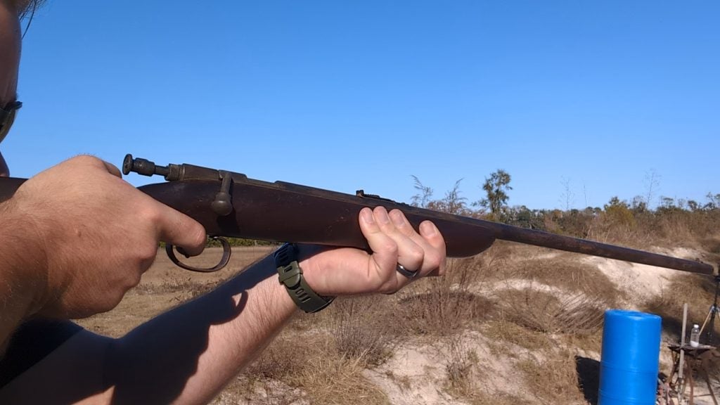 Shooters must manually pull the striker back to cock it. The gun features a rotating safety on the bolt. In the up position, it blocks the sights and indicates that the safety is on. Push it to the left, and the gun is ready to fire. It’s not fancy at all, and this type of simple rifle was popular in this era.