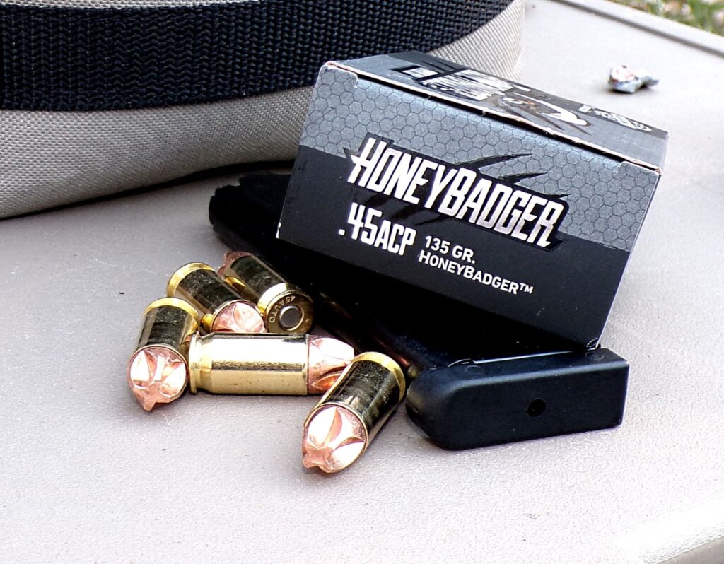 This stuff is vicious… that “Phillips-screwdriver-nose” cuts through ballistics gel like crazy. If you are looking for a really good defense load for your pet .45 (or 9mm, or .380, or several other caliber), you might want to check HoneyBadger (no typo – that’s how they spell it) out. But… be aware that some .45s, especially those built on the plain-jane 1911A1 platform, may not feed the first round reliably. I’ve had to hand-feed the first round into the chamber with two other pistols – the remaining rounds all fed properly. Not all .45s exhibit this – you just need to check. Once the first shot was fired, subsequent rounds were fed from the magazine.