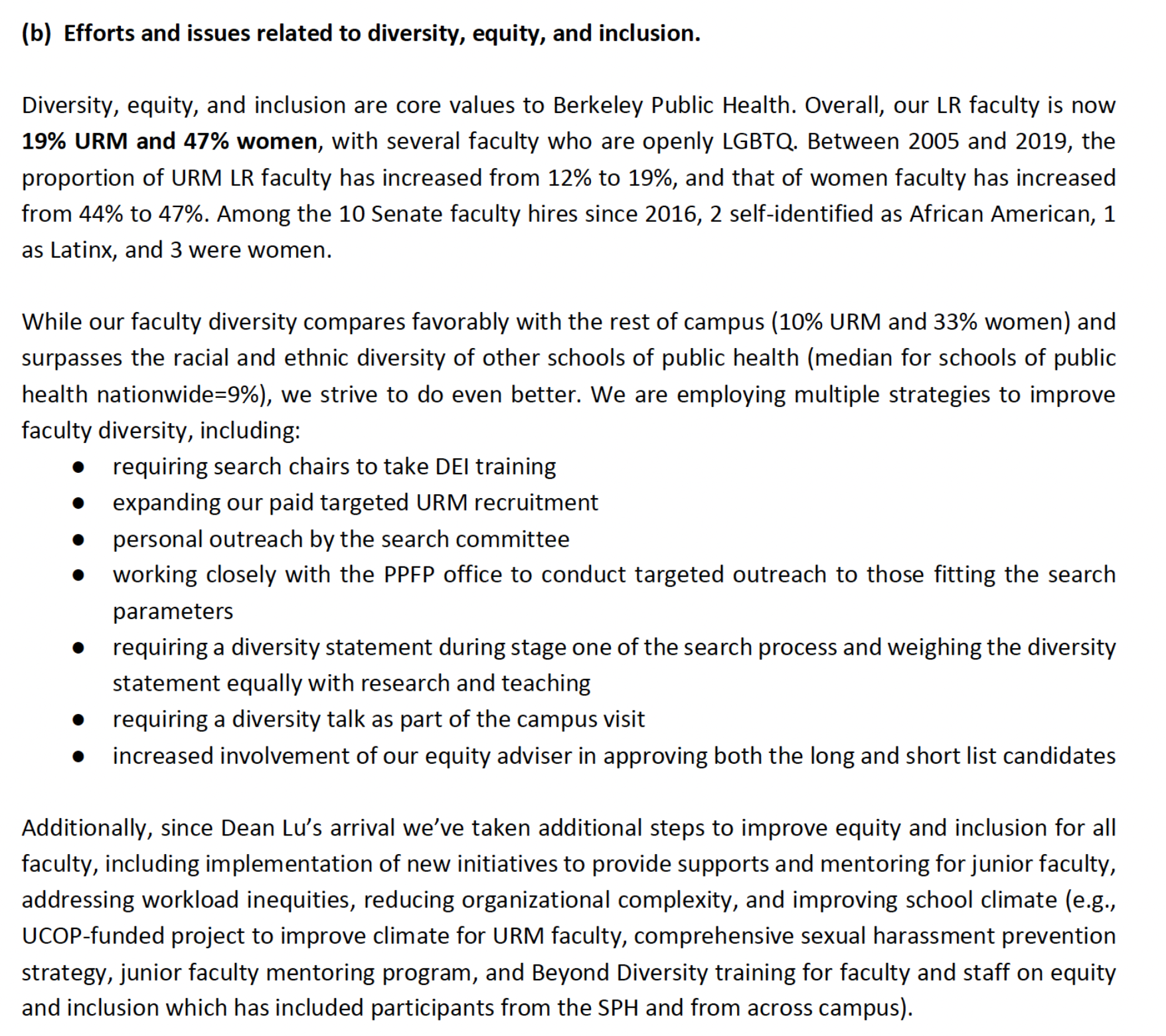 Efforts to ensure ideological conformity extended to faculty searches, which, at the school of public health, gave diversity statements the same weight as “research and teaching,” according to a 2021 hiring request obtained by the Free Beacon. While the University of California system recently ended its use of diversity statements, Berkeley’s public health program has other ways of screening for DEI, such as a requirement that all job candidates deliver a “diversity talk” as part of their campus visit.