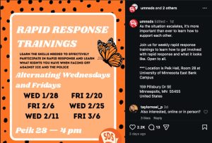 UMN SDS also holds weekly “rapid response trainings” on the University of Minnesota’s campus. It organizes school walkouts as well.