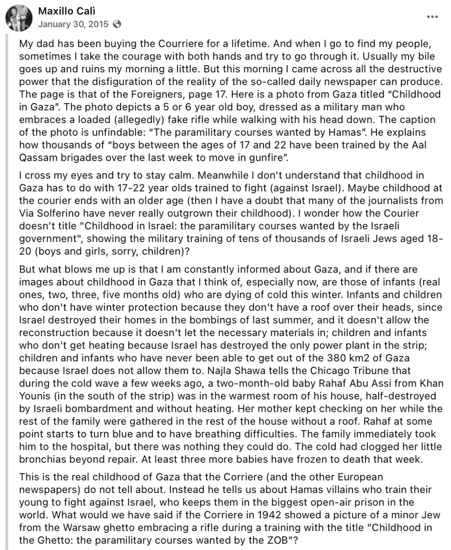 “Yes, I was angry with the government,” he said. “I don’t understand why an issue that affects Italians across the board isn’t being raised with the necessary force on the political agenda. Do you know how many people, even on the right, are calling for an end to the genocide? Recognition of the State of Palestine and a willingness to suspend the E.U.-Israel Association Agreement should be the starting point for a political initiative.”