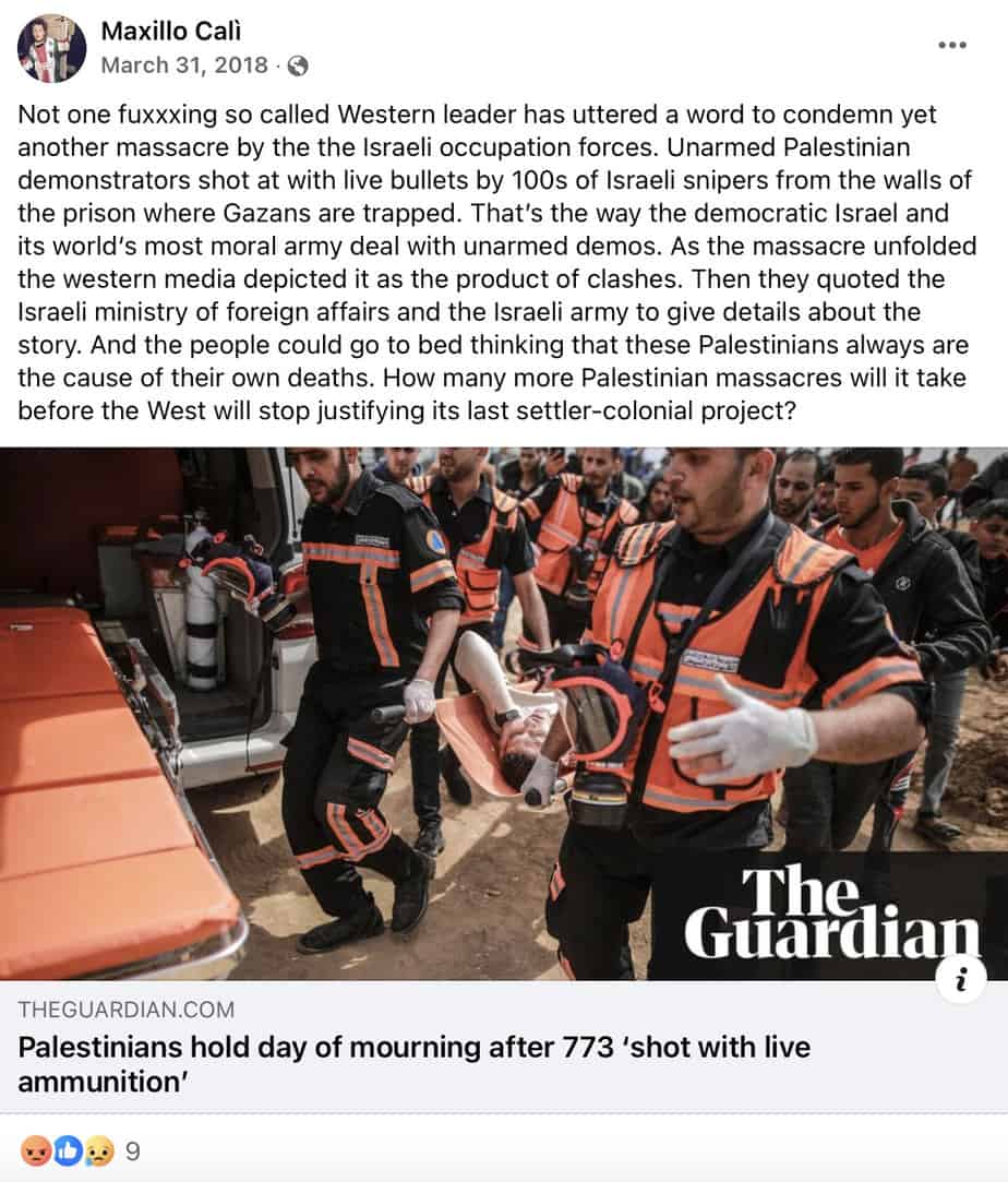 One post, which was on Cali’s Facebook page for 10 years until being deleted last week, described Israeli prime minister Benjamin Netanyahu as a “mass murderer” who should be charged at the International Criminal Court.