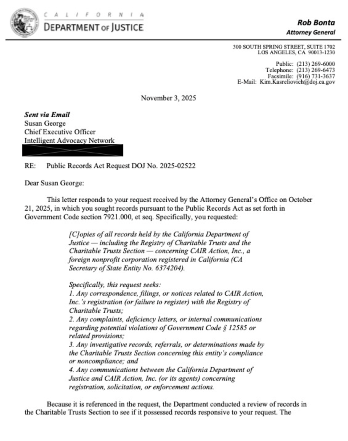 Even in California—one of CAIR’s largest and most active hubs—CAIR Action is only registered as an out-of-state nonprofit corporation, the report states. It is not registered with the California Attorney General’s Registry of Charitable Trusts, as is required within 60 days of fundraising in the state, and has not filed the CT-1 form necessary for any charitable organization to operate. In fact, CAIR Action “has received no authorization to solicit funds,” according to a Nov. 3 letter from the California Attorney General’s office contained in the NCRI report.