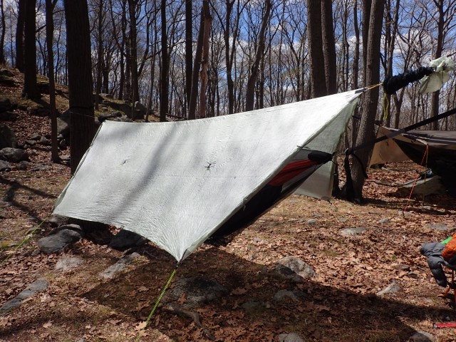 - Tarp overhead: creates a roof against snow, rain, and wind.