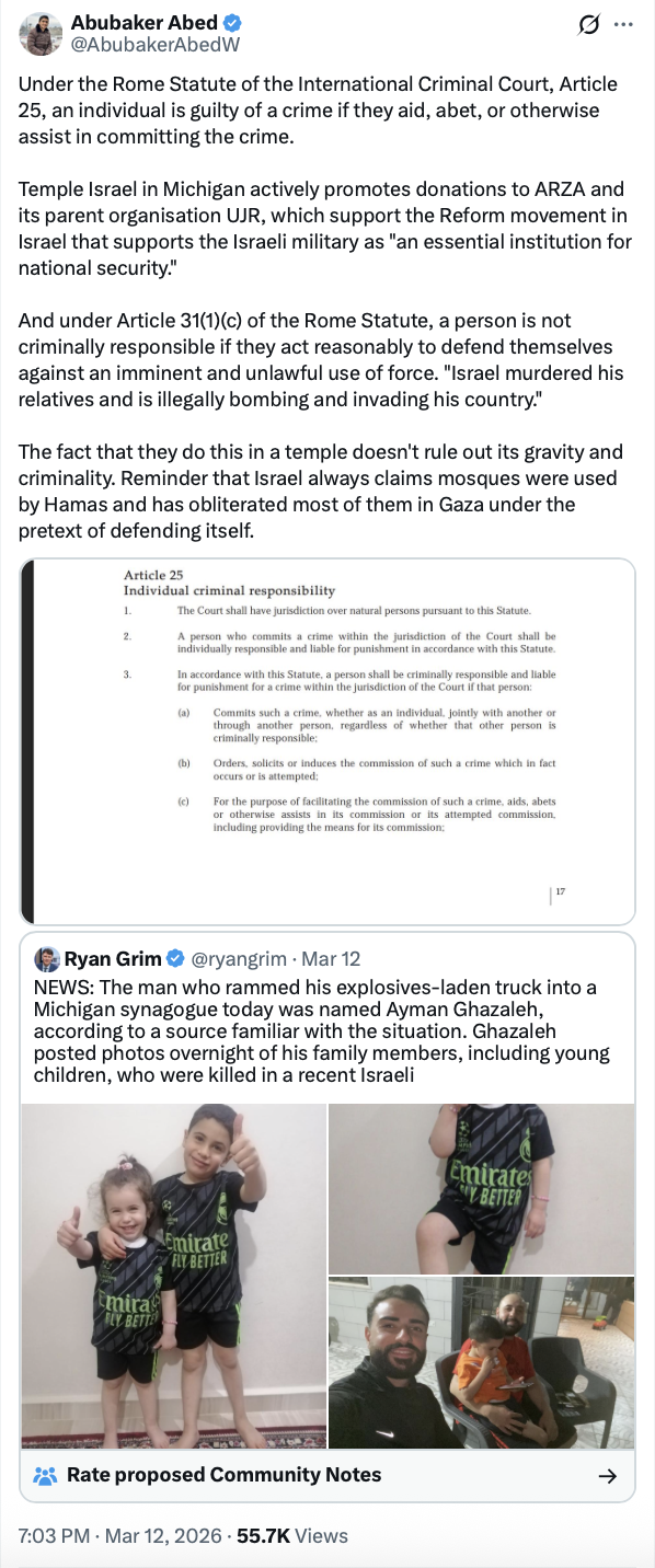 “A person is not criminally responsible if they act reasonably to defend themselves against an imminent and unlawful use of force,” wrote Abed in a post on X. “Israel murdered his relatives and is illegally bombing and invading his country.”
