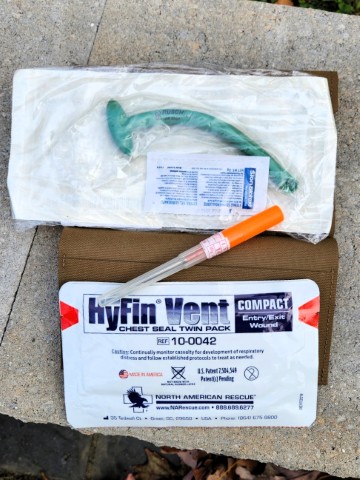 Marc also added a needle for pneumothorax, similar to the ARS. It has a similar size and 14 gauge by 3.24 inches. A decompression needle, like the ARS, punches through chest pressure when a lung collapses and starts crowding the heart. Medics use it to relieve tension pneumothorax—a fancy term for “your chest turned into a balloon and it’s not funny.”