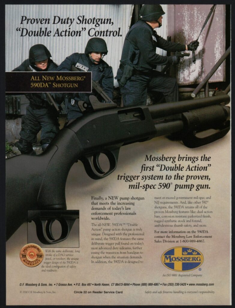 In 2000, Mossberg introduced the 590DA. DA stands for double-action, and Mossberg used a double-action-only style trigger in this line of shotguns. The thinking was that most cops were carrying DA/SA or DA pistols in this era. This would make it easy for a cop to transition from their handgun to their revolver.