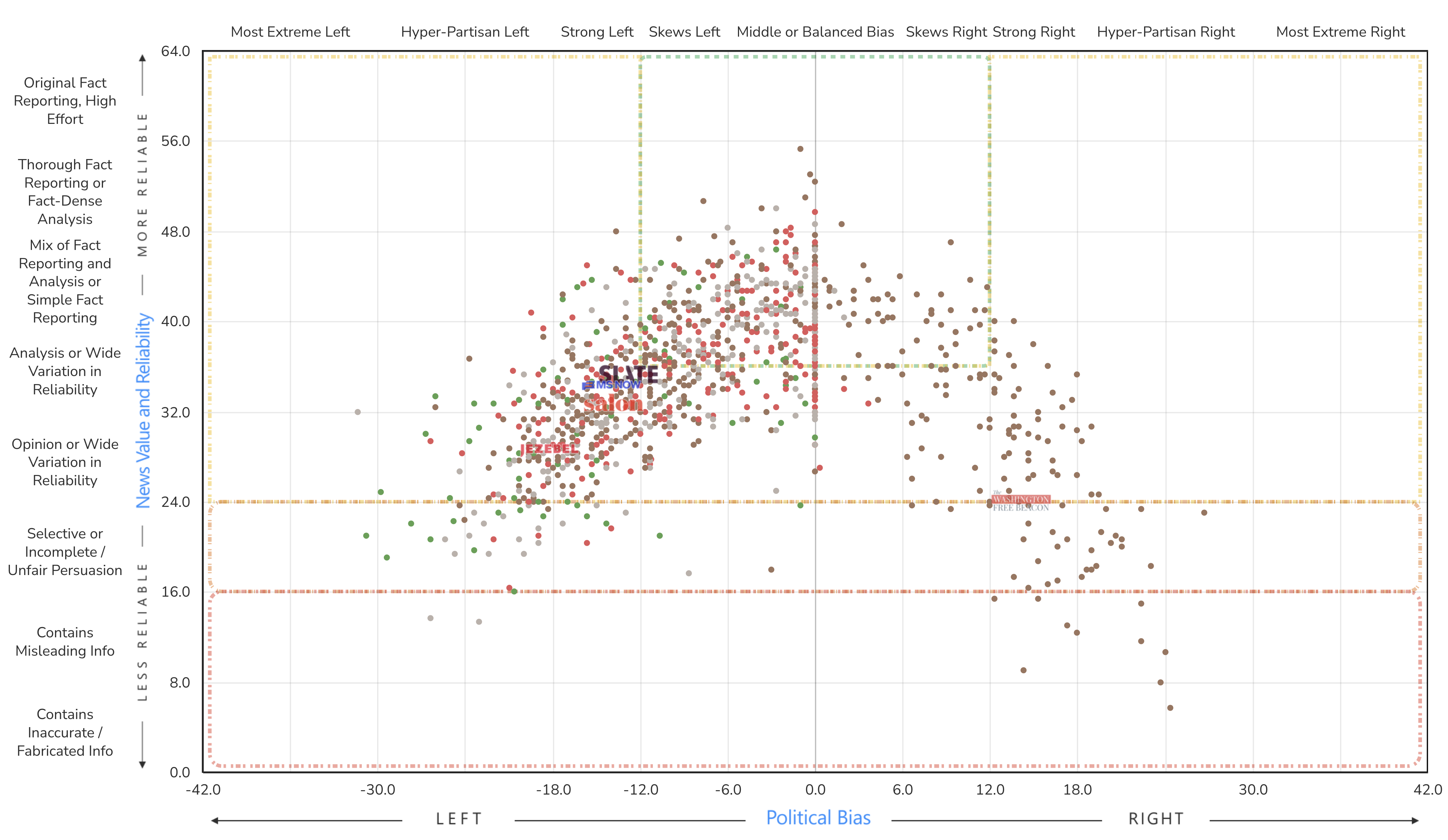 The revelation comes amid questions about Ad Fontes’s reliability. The group publishes a “Media Bias Chart” that categorizes U.S. news outlets by political leanings and trustworthiness using two axes: one for ideological bias that runs from -42 on the left to +42 on the right and another for reliability that goes from 0 to 64.