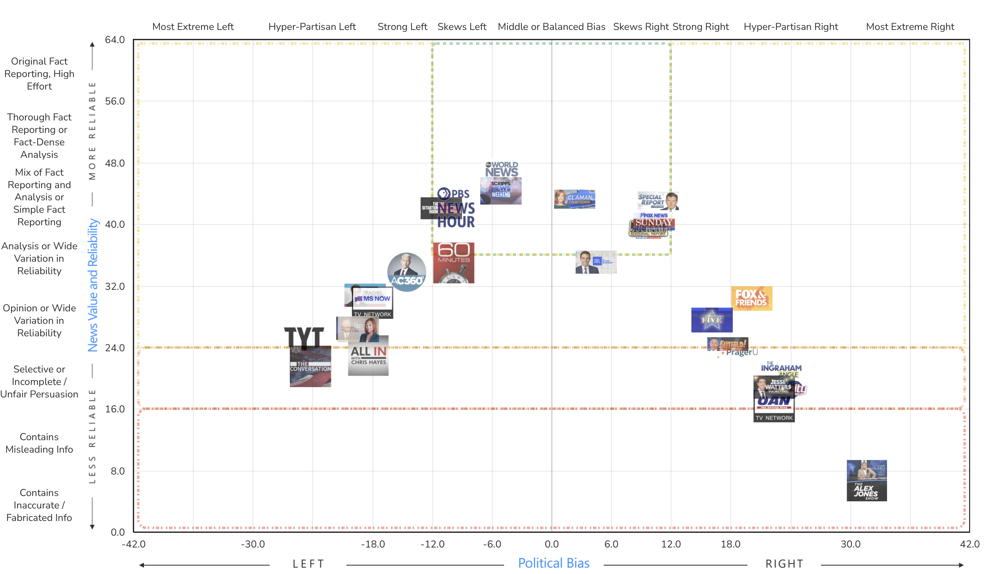 On television, Ad Fontes considers Fox News hosts like Sean Hannity, Laura Ingraham, and Jesse Watters to be more biased and less reliable than left-wing counterparts like Chris Hayes, Rachel Maddow, and Jen Psaki.