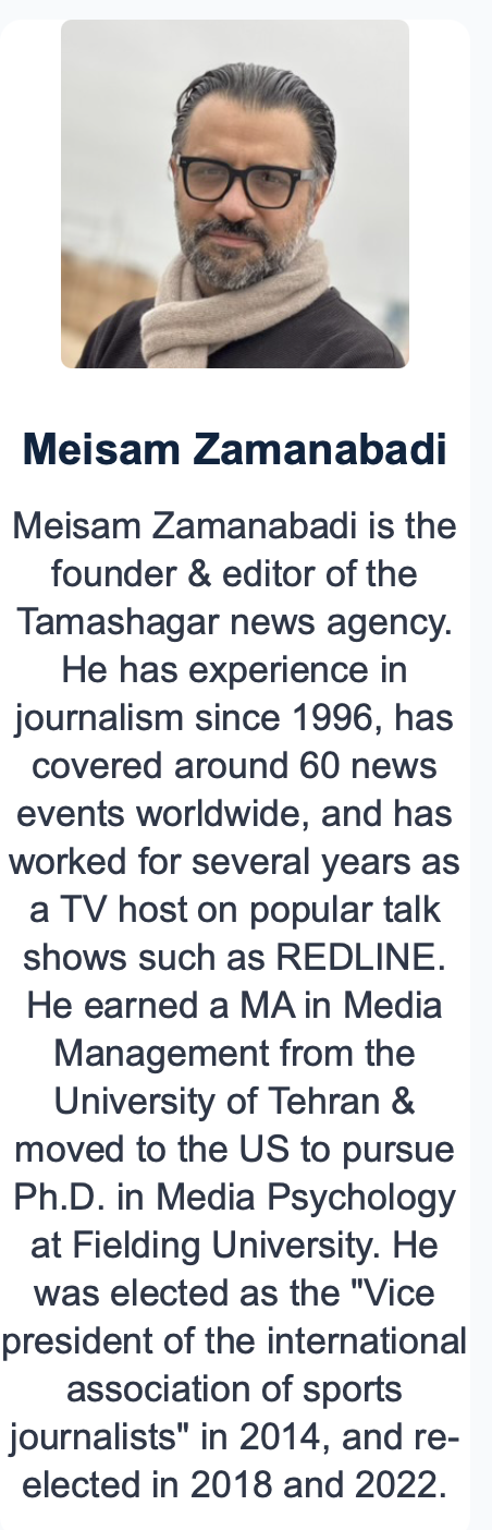Zamanabadi, who grew up and went to college in Iran, is based in California. Ad Fontes’s website describes him as the “founder & editor of the Tamashagar news agency,” an Iranian sports news website, and says he has worked in “journalism since 1996.”