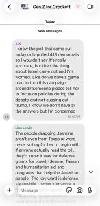 The poll prompted Gen Z for Crockett member Joey LC to express concern that Talarico was “gaining steam.” He asked the administrators if they knew “what the campaign has cooking up in the coming weeks? What are y’all’s thoughts?”