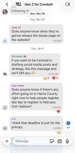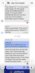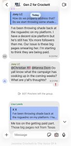 Joey LC replied, “Yeah, [not going to lie]. The fact that Talarico beat us to the punch in this one will put us at a disadvantage. We either need to post our issues website soon or not at all and focus solely on anti-maga [sic] messaging.”