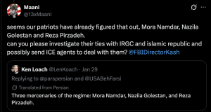 “Seems our patriots have already figured that out” that Namdar is behind the effort, another account wrote on a thread tagging the FBI. “Can you please investigate their ties with IRGC and islamic republic and possibly send ICE agents to deal with them.”