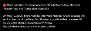 Officials first spotted the smear campaign in mid-November, when an X account purportedly affiliated with the Pahlavi movement, @Gmod_irian, published a lengthy diatribe accusing Namdar of using her senior role at the State Department to undermine Iranian dissidents fighting the regime. While that account poses online as an anti-regime activist, open source information confirmed by Trump administration officials indicates that its owner is an Islamic Republic affiliate.