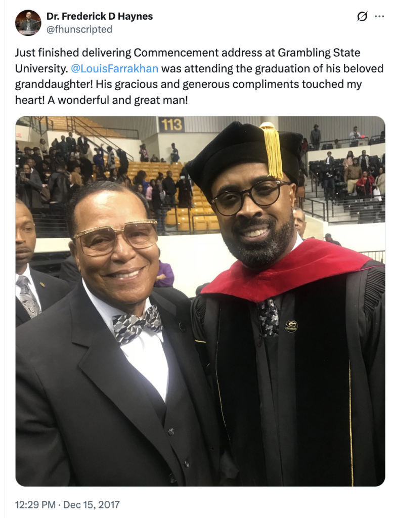Haynes, for example, posted a selfie with Farrakhan at a 2019 event and referred to the Nation of Islam leader, who once called Adolf Hitler a “great man,” as a “wonderful and great man.” His mentor, meanwhile, is Jeremiah Wright, the former pastor of Barack Obama who stoked outrage during the 2008 presidential race over a sermon in which he shouted, “God damn America.”