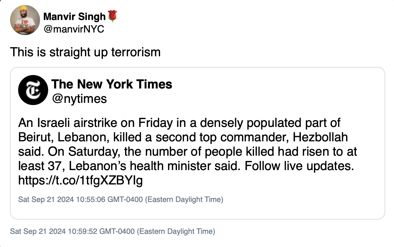 Another new hire, Manvir Singh, is now serving as a senior policy analyst in Mamdani’s administration. Like many other Mamdani appointees, Singh deleted his X account after old posts—including one in support of defunding the police—came to light. A Free Beacon review of his old X account found several other extremist posts, including one in which Singh accused Israel of committing “terrorism” with its operations against Hezbollah in Lebanon.