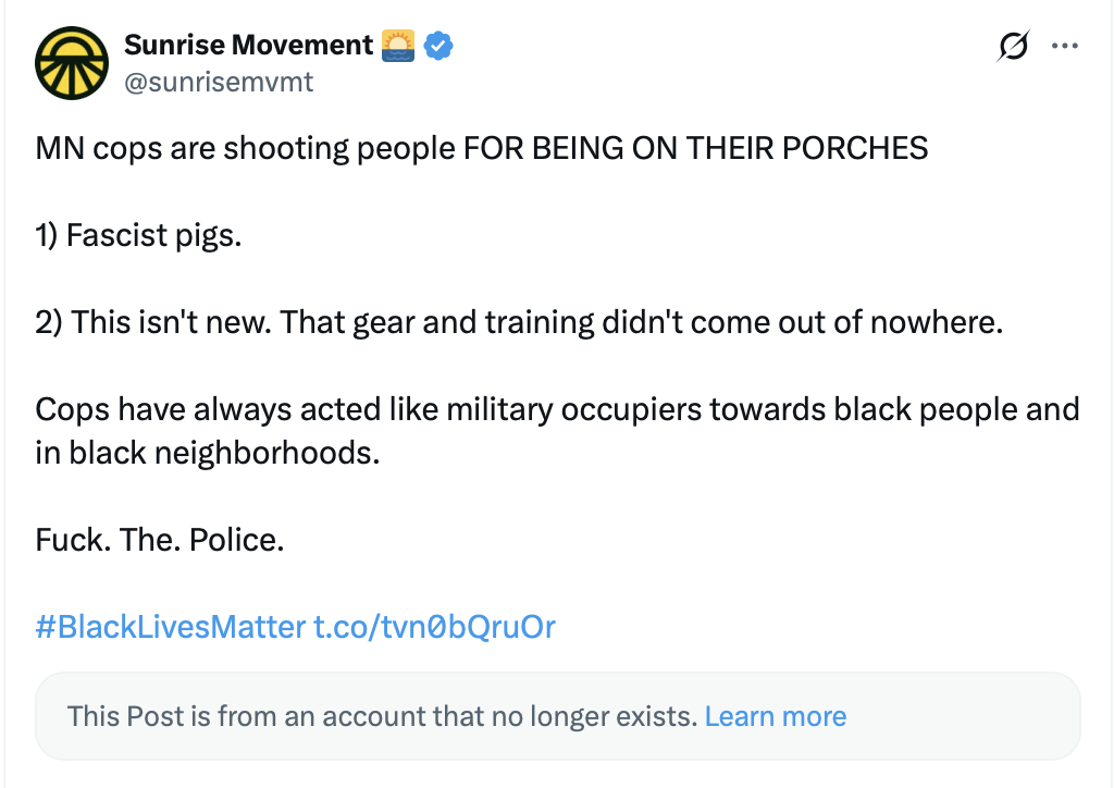 In other posts, the Sunrise Movement described cops as “Fascist pigs” who are “here to uphold and enforce white supremacy in our communities and nothing else.”