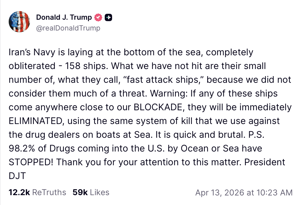 “Iran’s Navy is laying at the bottom of the sea, completely obliterated – 158 ships,” Trump wrote. “What we have not hit are their small number of, what they call, ‘fast attack ships,’ because we did not consider them much of a threat. Warning: If any of these ships come anywhere close to our BLOCKADE, they will be immediately eliminated, using the same system of kill that we use against the drug dealers on boats at Sea. It is quick and brutal.”