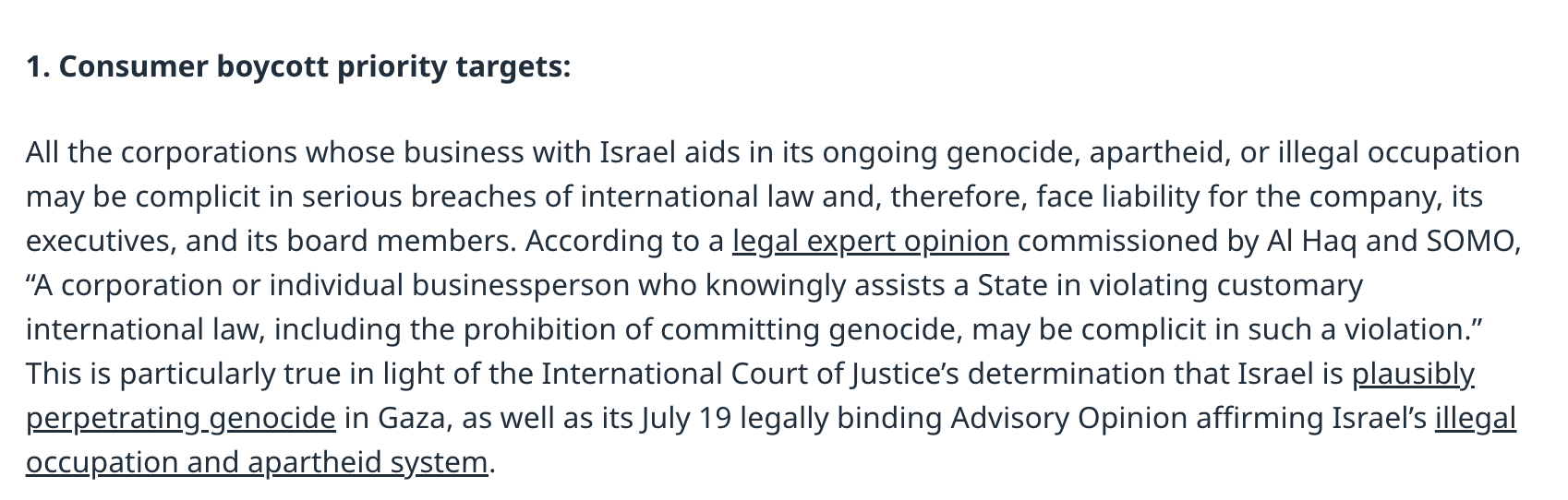 The official Boycott, Divestment, and Sanctions (BDS) movement—which, according to its co-founder, seeks the end of Israel—has featured SOMO’s work. A December 2024 post on the BDS movement’s website notes that, “according to a legal expert opinion commissioned by Al Haq and SOMO, ‘A corporation or individual businessperson who knowingly assists a State in violating customary international law, including the prohibition of committing genocide, may be complicit in such a violation.'”