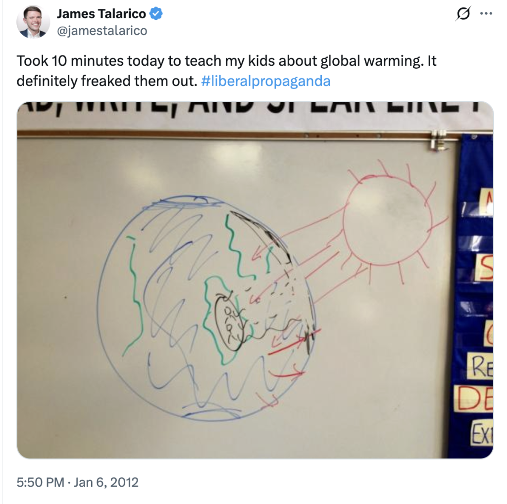 Years earlier, while working as a middle school teacher, Talarico tweeted that he “took 10 minutes today to teach my kids about global warming.” He shared a photo of a drawing on a whiteboard that depicted the sun’s rays hitting Earth, adding, “It definitely freaked them out. #liberalpropaganda.”