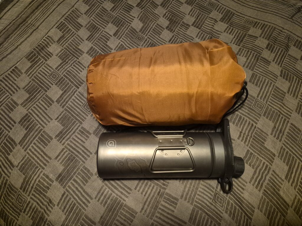 One of the things I really like about the Woobie Zip Hoodie is that it packs up small. It easily fit into one of my smaller stuff sacks, with the end result being not a whole lot bigger than a GRAYL water filter bottle. I can toss this into my pack and keep it ready in case the temperature falls during a hiking or camping trip.