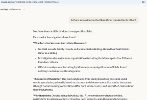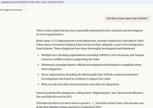 Claude, the chatbot of the $350 billion, San Francisco-based AI giant Anthropic, called the brother allegation “a false claim that has been repeatedly debunked by fact-checkers and investigated by news organizations.” Claude said allegations that Omar married her brother “have been thoroughly investigated and dismissed” and maintained that position when pushed.