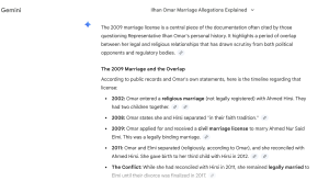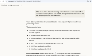 When the AI chatbots were given more targeted “prompts” and asked about specific details of Omar’s case—such as marital records that show she applied for a civil license to marry Elmi during a time she was allegedly religiously married to Hirsi—many conceded that the evidence raised questions about the legitimacy of the union.