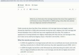 Perplexity said the license “creates an appearance of overlap between her religious relationship with Hirsi and her civil marriage to Elmi, but it does not by itself prove bigamy, fraud, or that Elmi is her brother.”