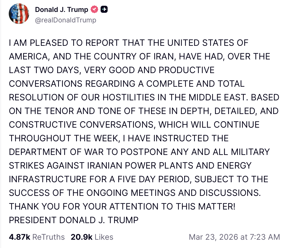 “I AM PLEASED TO REPORT THAT THE UNITED STATES OF AMERICA, AND THE COUNTRY OF IRAN, HAVE HAD, OVER THE LAST TWO DAYS, VERY GOOD AND PRODUCTIVE CONVERSATIONS REGARDING A COMPLETE AND TOTAL RESOLUTION OF OUR HOSTILITIES IN THE MIDDLE EAST,” Trump wrote in a Monday morning Truth Social post. “BASED ON THE TENOR AND TONE OF THESE IN DEPTH, DETAILED, AND CONSTRUCTIVE CONVERSATIONS, WHICH WILL CONTINUE THROUGHOUT THE WEEK, I HAVE INSTRUCTED THE DEPARTMENT OF WAR TO POSTPONE ANY AND ALL MILITARY STRIKES AGAINST IRANIAN POWER PLANTS AND ENERGY INFRASTRUCTURE FOR A FIVE DAY PERIOD, SUBJECT TO THE SUCCESS OF THE ONGOING MEETINGS AND DISCUSSIONS.”