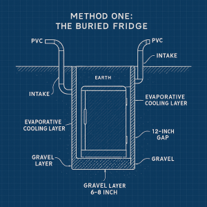 Keep in mind that none of these systems are install-and-forget. The buried fridge needs the evaporative layer kept damp in dry months. Clay coolers require daily water input. Deep pits need ventilation monitoring and occasional pump maintenance.